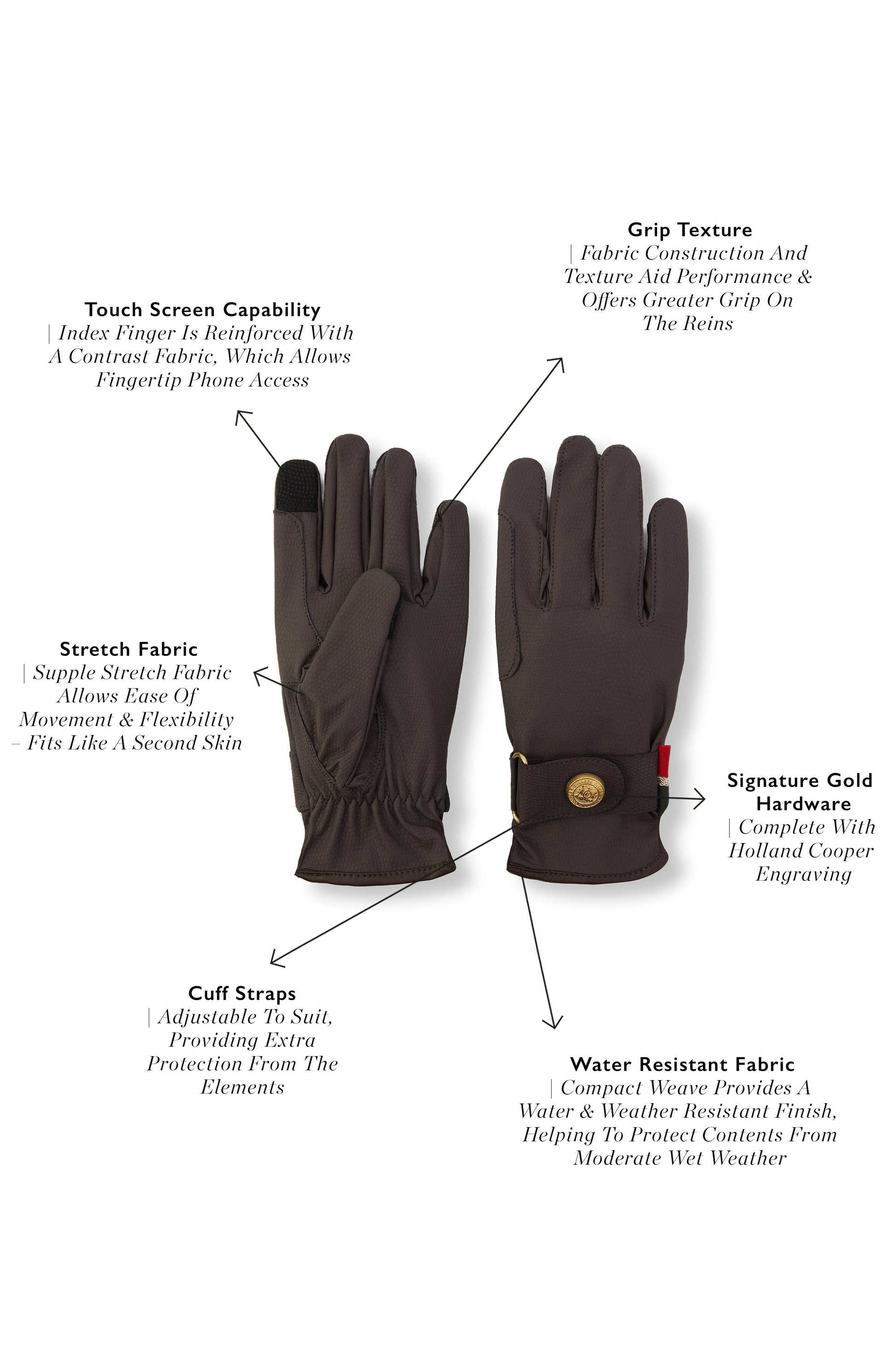 Our technical riding gloves are made from soft, supple fabric to fit like a second skin. Grip-enhancing while allowing for maximum movement, the sleek, ergonomic design aids performance and offers greater grip on the reins. Accessorised with a custom strap to suit all sizes with signature Holland Cooper branding.